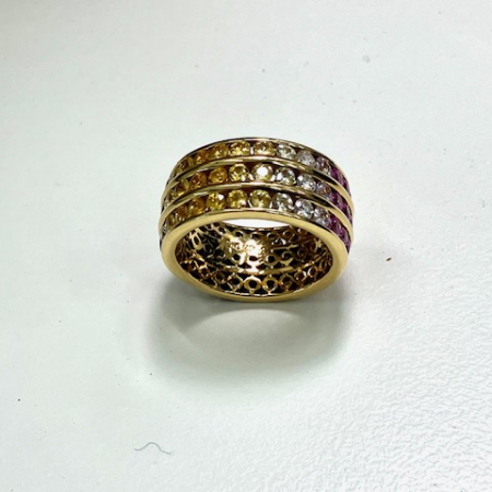 石言葉には「誠実」「慈愛」「徳望」といった意味合いがあり、ほかにも平和を祈り、一途な想いを貫くという意味が込められている宝石『カラフルサファイア付K18リング』買い取りました!!